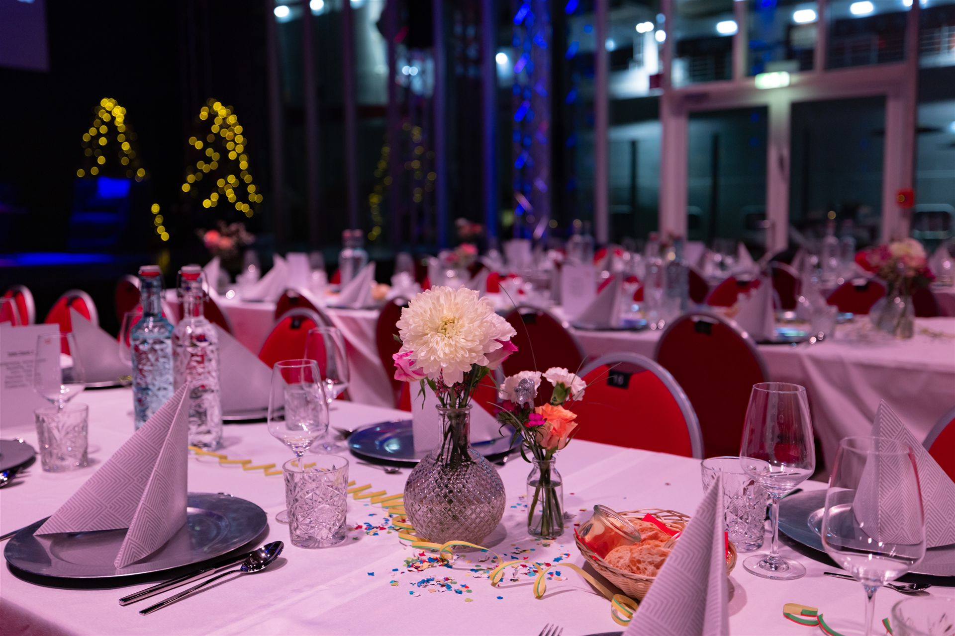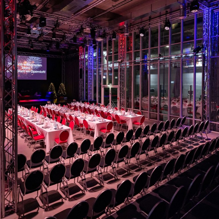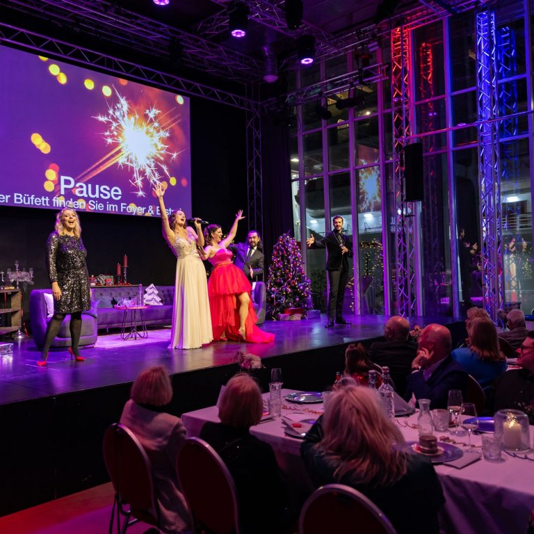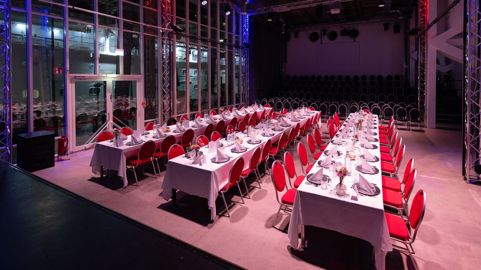 Sie sitzen entweder an den langen Tischen im Saal direkt vor der Bühne, an denen Sie auch speisen werden, oder auf unserer Tribüne in gewohnter Reihenbestuhlung.