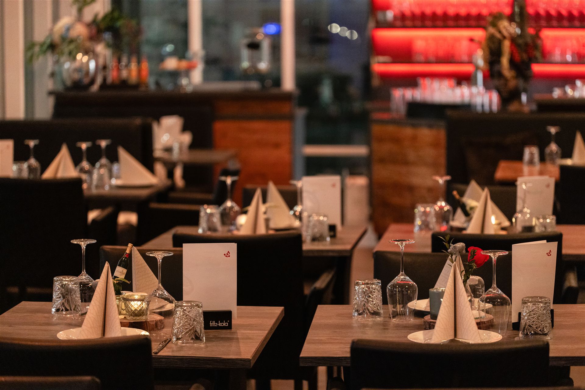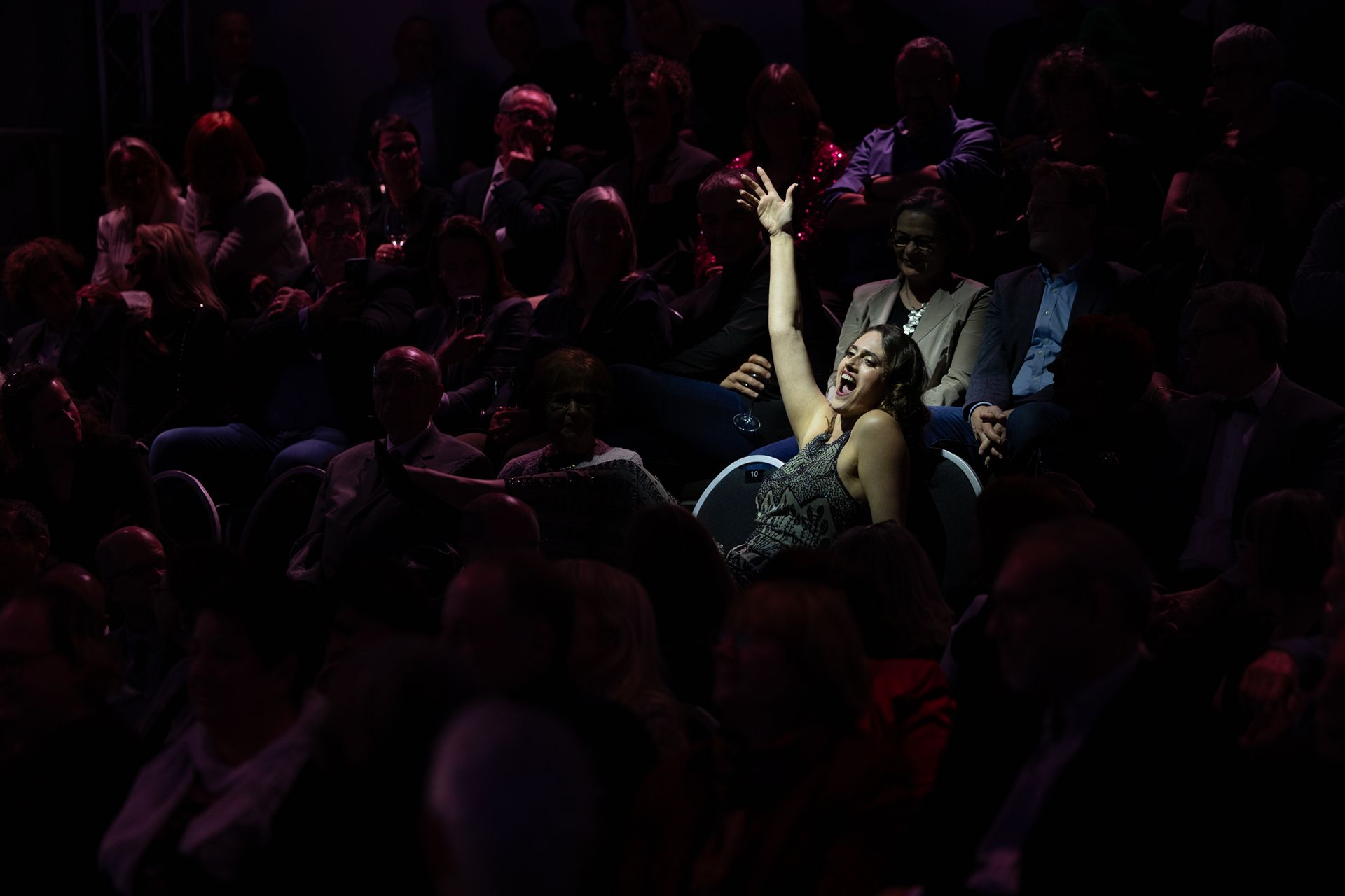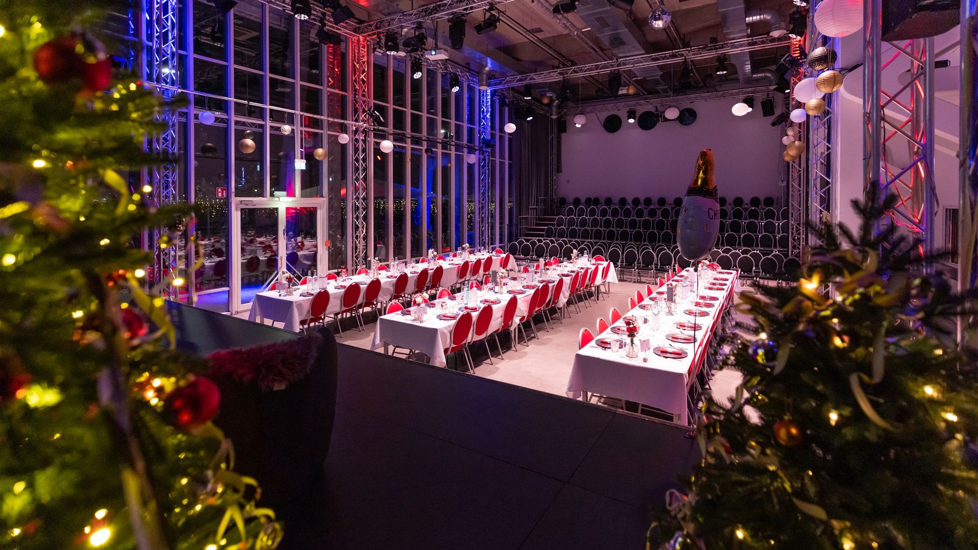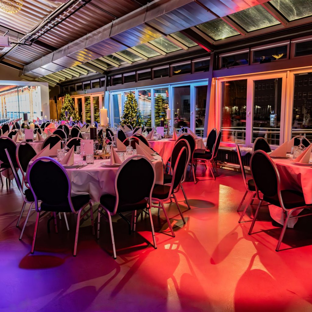 Sie sitzen entweder an den langen Tischen im Saal direkt vor der Bühne, an denen Sie auch speisen werden, oder auf unserer Tribüne in gewohnter Reihenbestuhlung.
