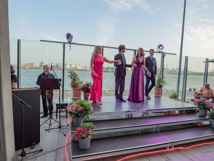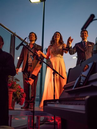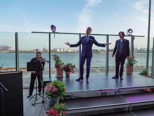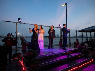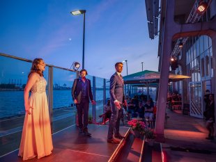 Am 16. Juli konnten wir unseren neuen Spielort direkt an der Elbe mit "Opera Italiana" endlich eröffnen. Mit dabei waren drei wohlbekannte Gesichter - und Stimmen aus dem Opernloft: Sopranistin Freja Sandkamm, die zuletzt mit dem Rolf-Mares-Preis für ihre Violetta in der Opernloft-Traviata ausgezeichnet wurde, Tenor Ljuban Zivanovic, bekannt aus Werther und ebenfalls "La Traviata" (und bald zu sehen in "Faust"!) und Bass-Bariton Timotheus Maas, der mit den Produktionen "Semiramis" und "Orpheus in der Unterwelt" ab Herbst auf der Opernloftbühne zu erleben sein wird. Zu hören gab es italienische Arien und neapolitanische Canzonen. Begleitet wurden die drei von Pianistin Makiko Eguchi und Violinist André Böttcher.