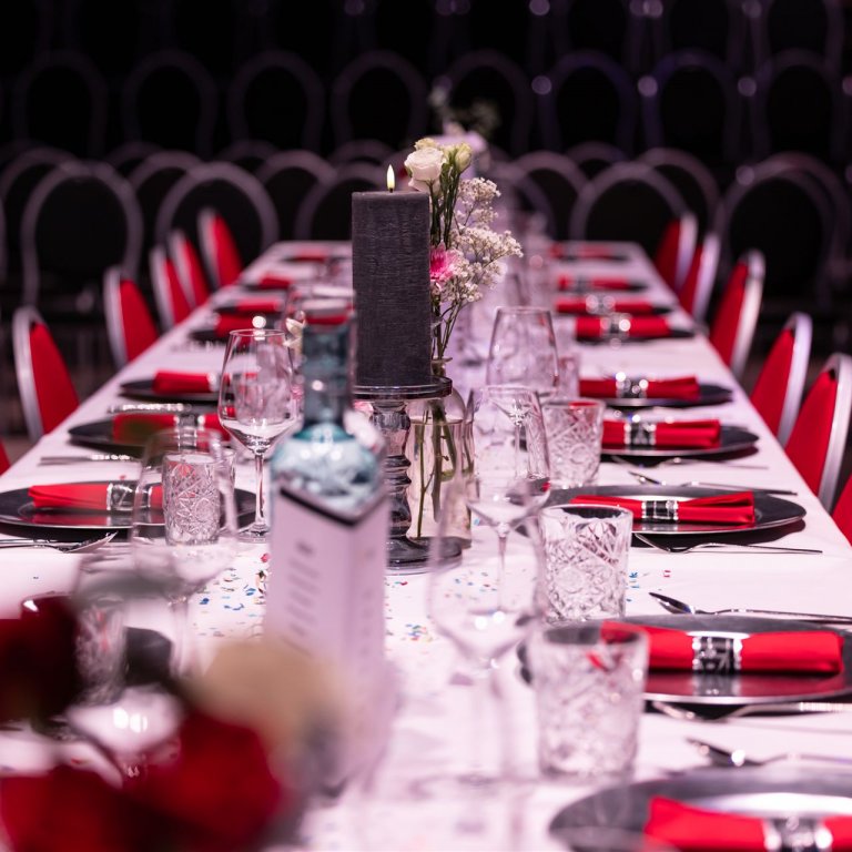 Sie sitzen entweder an den langen Tischen im Saal direkt vor der Bühne, an denen Sie auch speisen werden, oder auf unserer Tribüne in gewohnter Reihenbestuhlung.