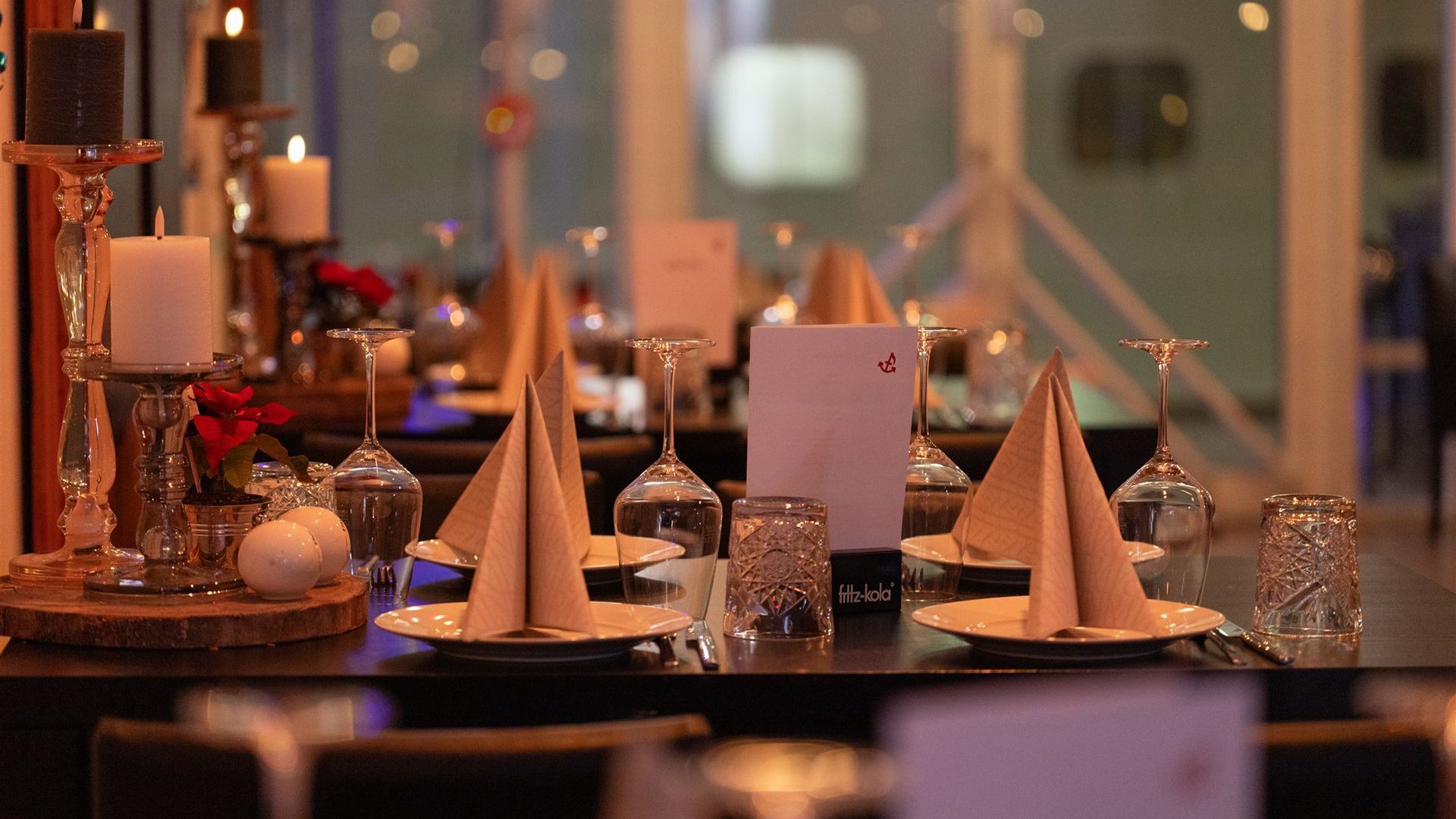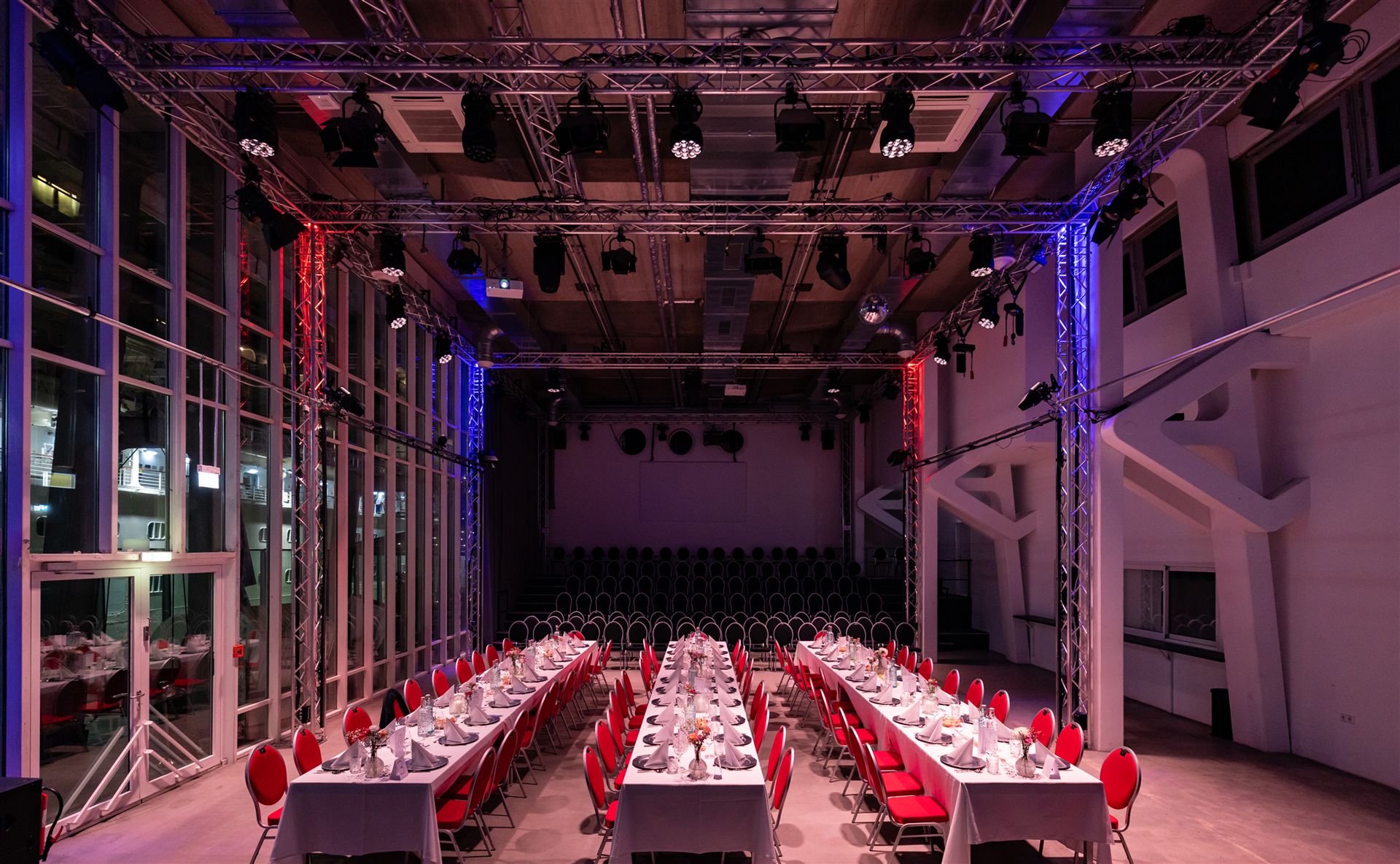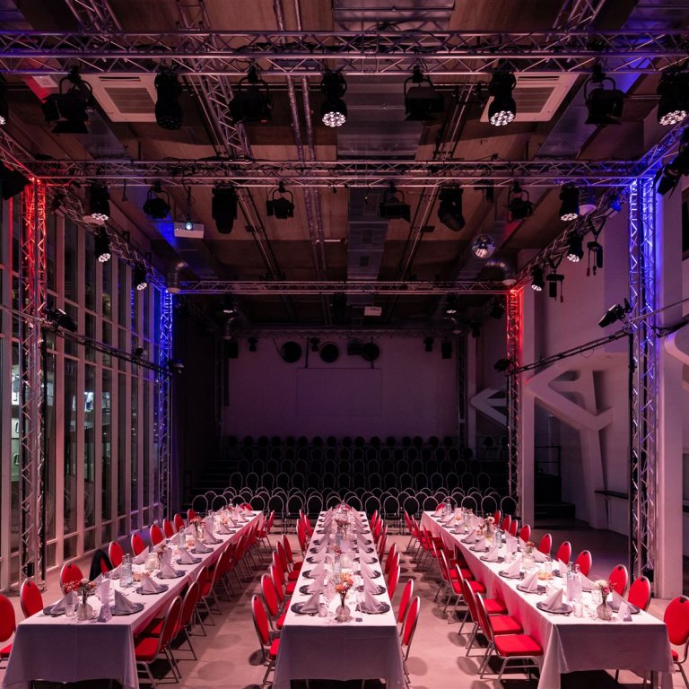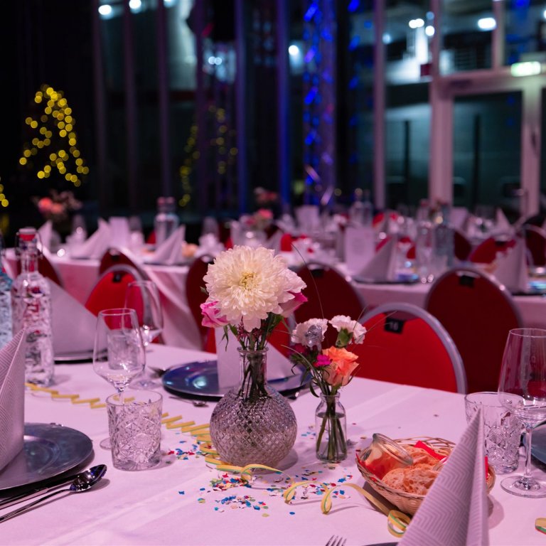 Sie sitzen entweder an den langen Tischen im Saal direkt vor der Bühne, an denen Sie auch speisen werden, oder auf unserer Tribüne in gewohnter Reihenbestuhlung.