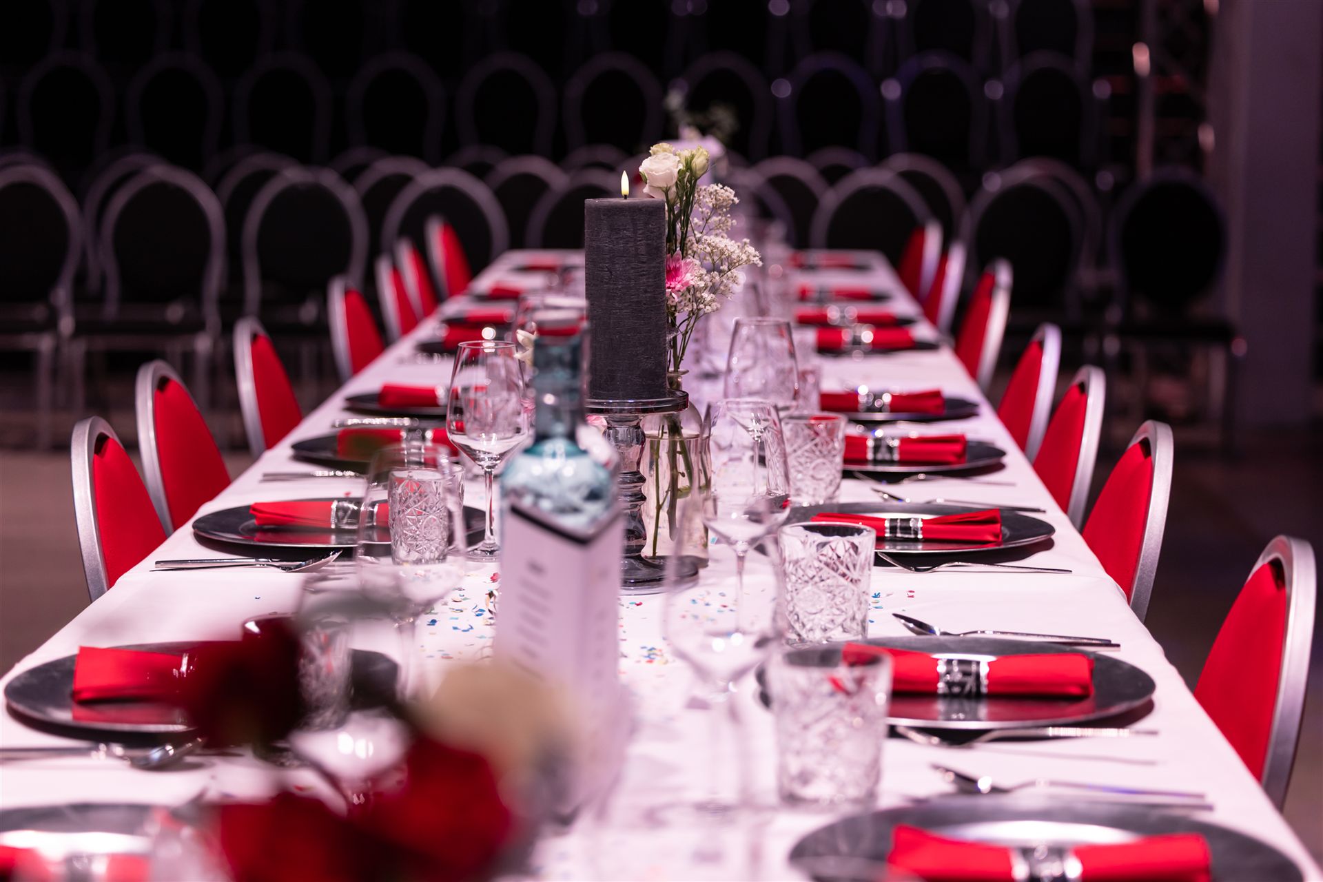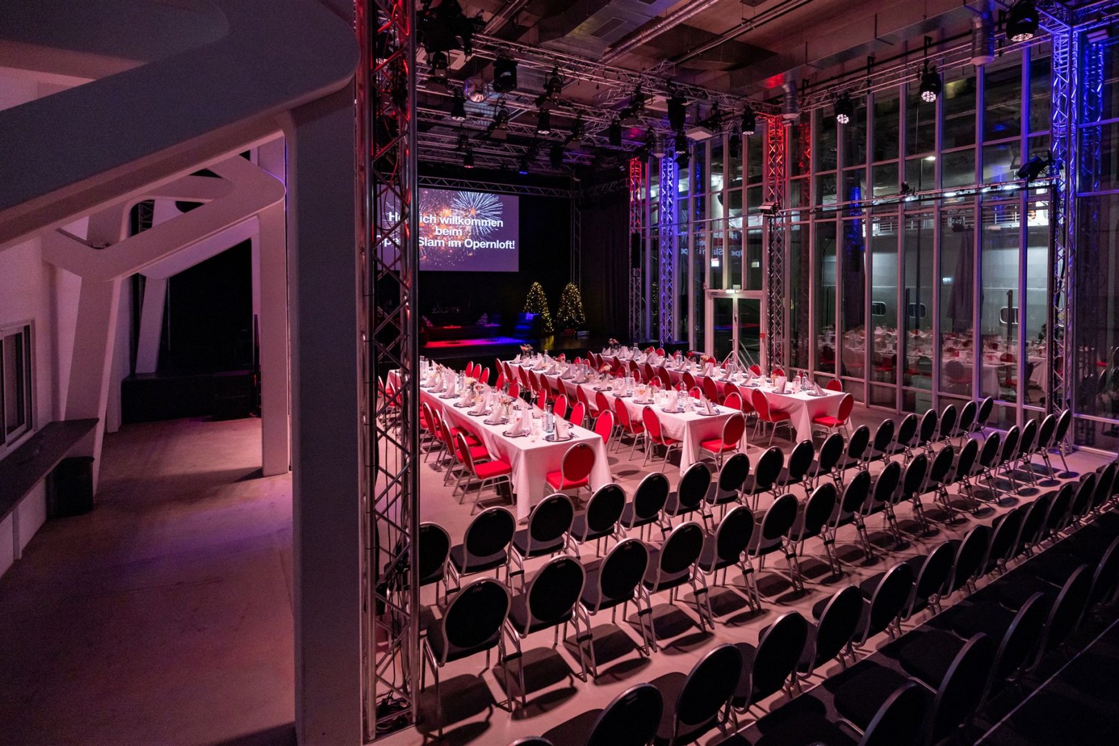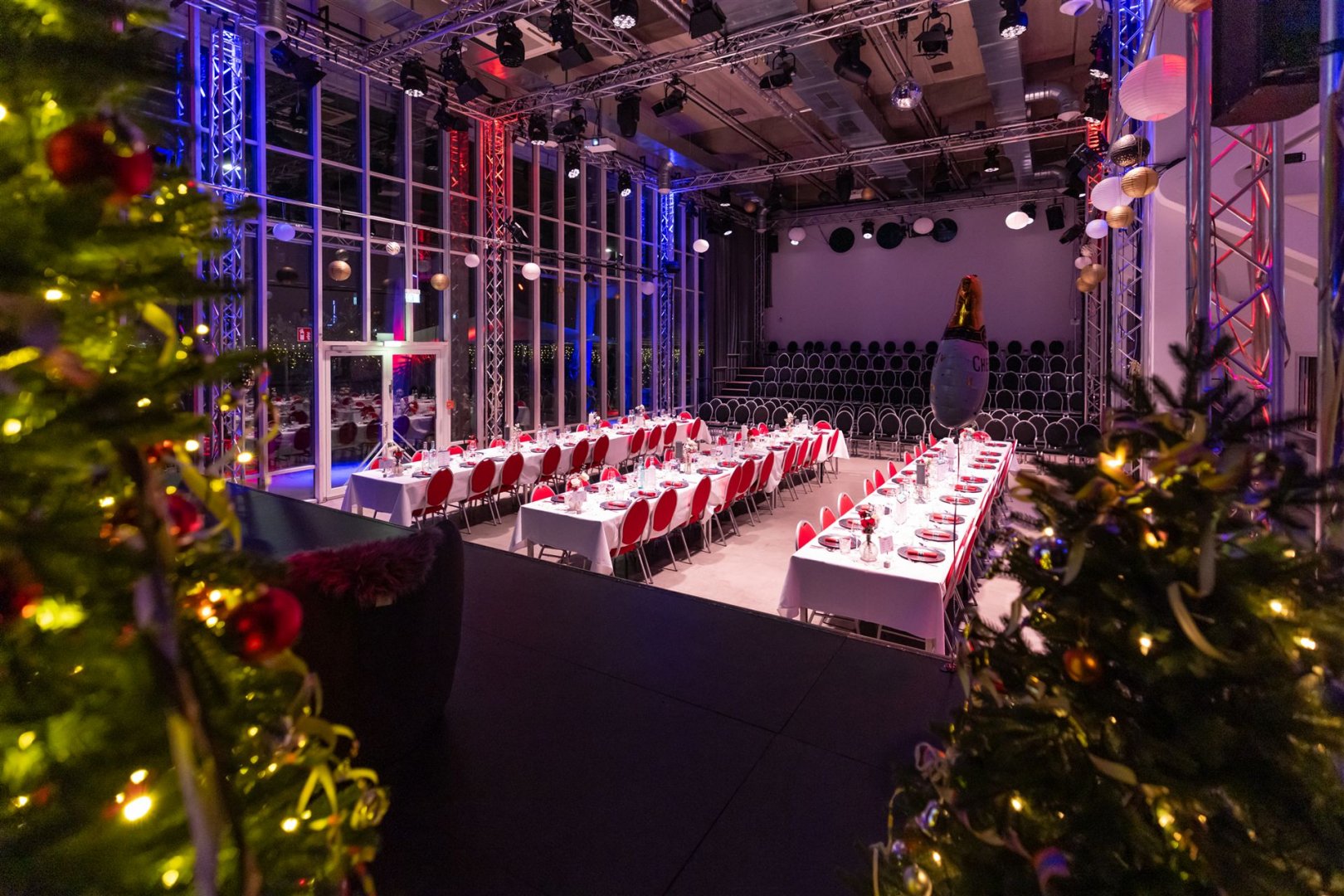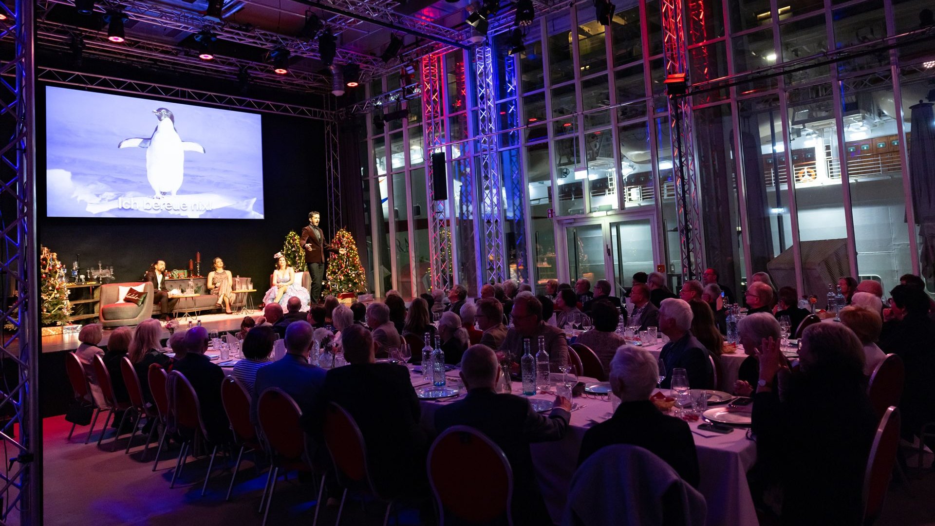 Sie sitzen entweder an den langen Tischen im Saal direkt vor der Bühne, an denen Sie auch speisen werden, oder auf unserer Tribüne in gewohnter Reihenbestuhlung.